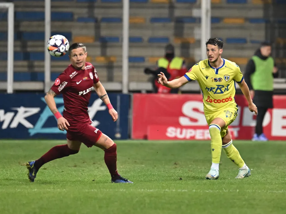 Ciprian Ioan Deac si Lucian Mihai Dumitriu in meciul de fotbal dintre Petrolul Ploiesti si CFR Cluj, din cadrul Superligii Superbet, desfasurat pe Stadionul Ilie Oana din Ploiesti, sambata 19 octombrie 2024. © FOTO:Razvan Pasarica/SPORT PICTURES