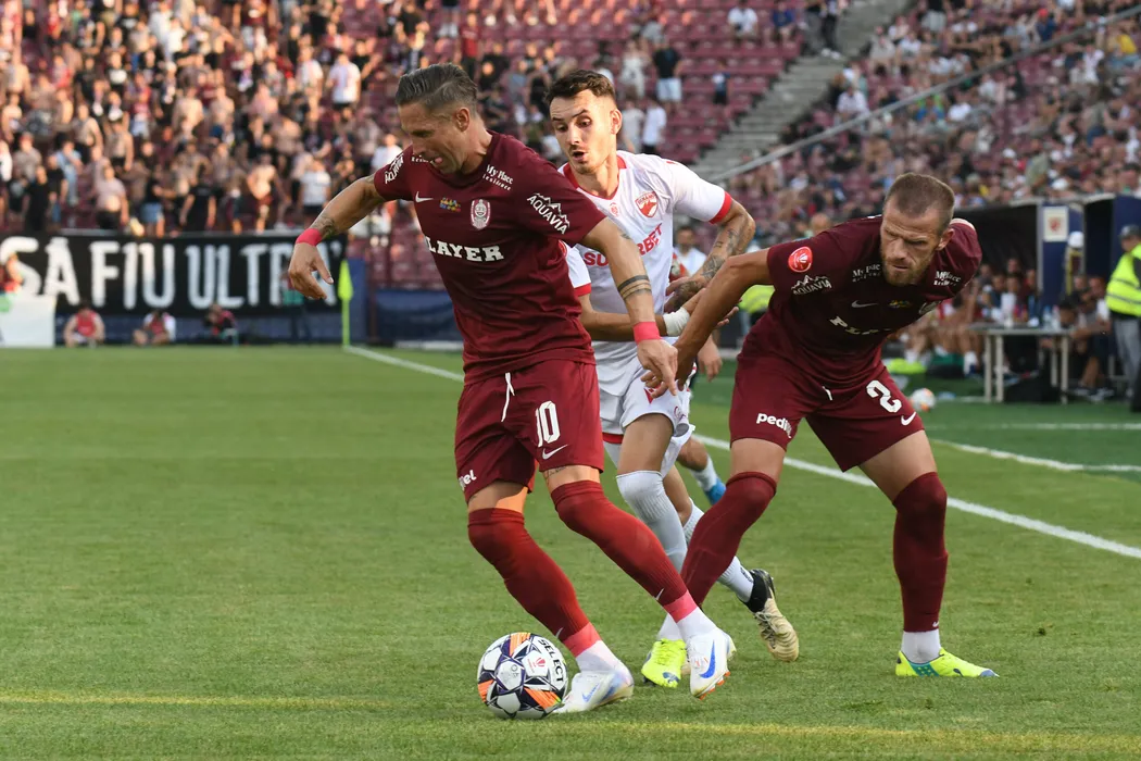 Ciprian Ioan Deac, Armend Thaqi și Raul Marian Opruț în meciul de fotbal dintre FC CFR 1907 Cluj si Dinamo București, contând pentru Superliga Superbet, desfășurat pe Stadionul Dr.Constantin Rădulescu din Cluj-Napoca, duminică 14 iulie 2024. © FOTO: Flaviu BUBOI/SPORT PICTURES