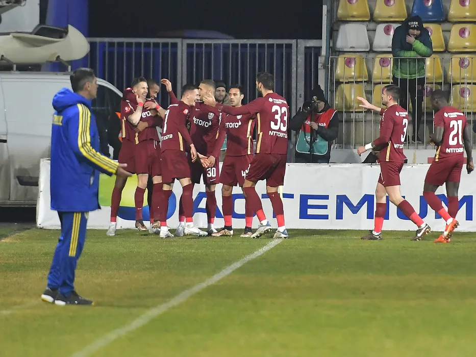 Bucurie a fotbalistilor clujeni dupa un gol marcat cu Ciprian Ioan Deac, Ermal Krasniqi, George Daniel Birligea si Mario Camora in meciul de fotbal dintre Petrolul Ploiesti si CFR Cluj, contand pentru Superliga Superbet, desfasurat pe Stadionul Ilie Oana din Ploiesti, luni 27 februarie 2023. © FOTO:Razvan Pasarica/SPORT PICTURES