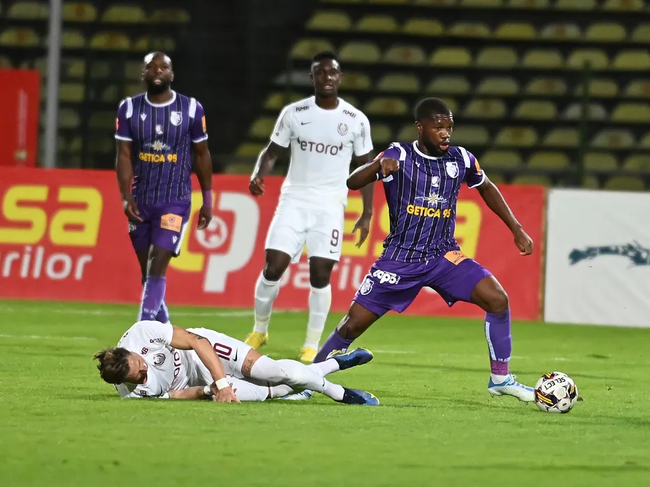Ciprian Ioan Deac si Tony Wilfried Nyandjou Njike in meciul de fotbal dintre FC Arges si CFR Cluj, contand pentru Superliga Superbet, desfasurat pe Stadionul Nicolae Dobrin din Pitesti, luni 19 septembrie 2022. © FOTO:Razvan Pasarica/SPORT PICTURES