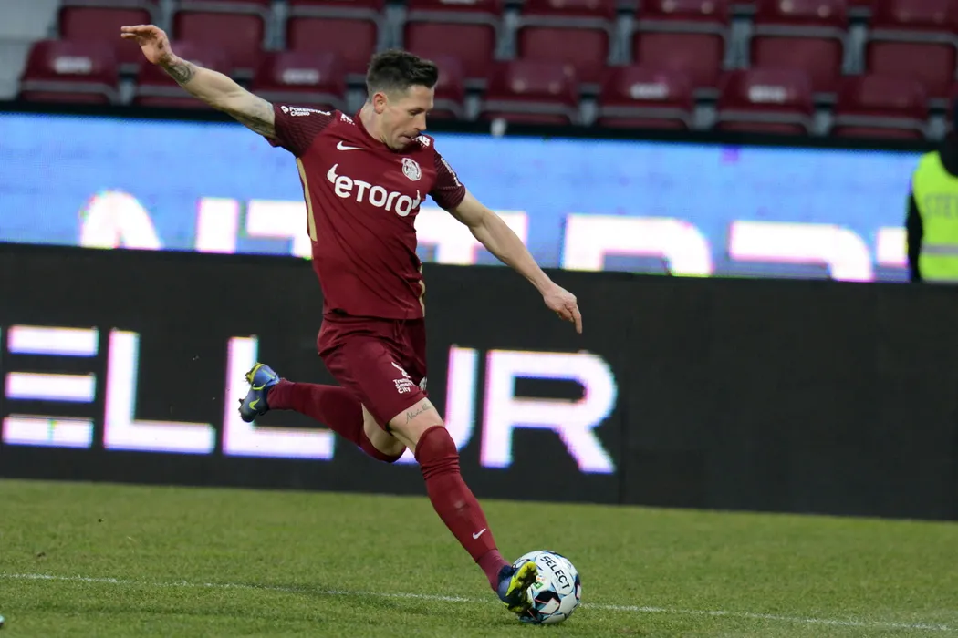 Ciprian Deac, de la CFR Cluj, suteaza in timpul meciului de fotbal contra echipei Dinamo din etapa 30 a Ligii 1, disputat pe stadionul Dr. Constantin Radulescu, duminica, 6 martie 2022. DAN HORIA TAUTAN / MEDIAFAX FOTO