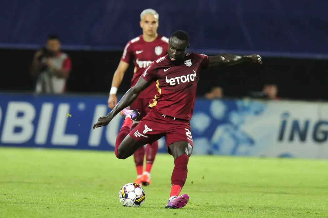 Nana Boateng, de la CFR Cluj, suteaza in timpul meciului de fotbal contra echipei Pyunik Everan din returul primului tur preliminar al Ligii Campionilor, disputat pe stadionul Dr. Constantin Radulescu din Cluj-Napoca, miercuri, 13 iulie 2022. DAN HORIA TAUTAN / MEDIAFAX FOTO