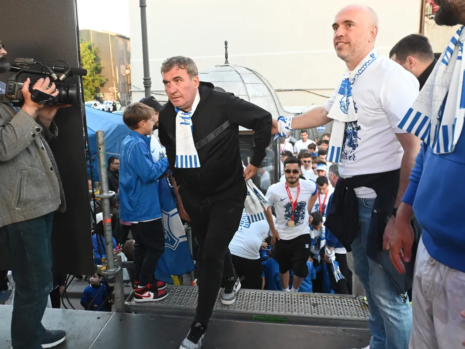 Gheorghe Hagi si Costin Mega urca pe scena in Piata Ovidiu din Constanta, cu ocazia prezentarii trofeului, luni 22 mai 2023. © FOTO:Razvan Pasarica/SPORT PICTURES