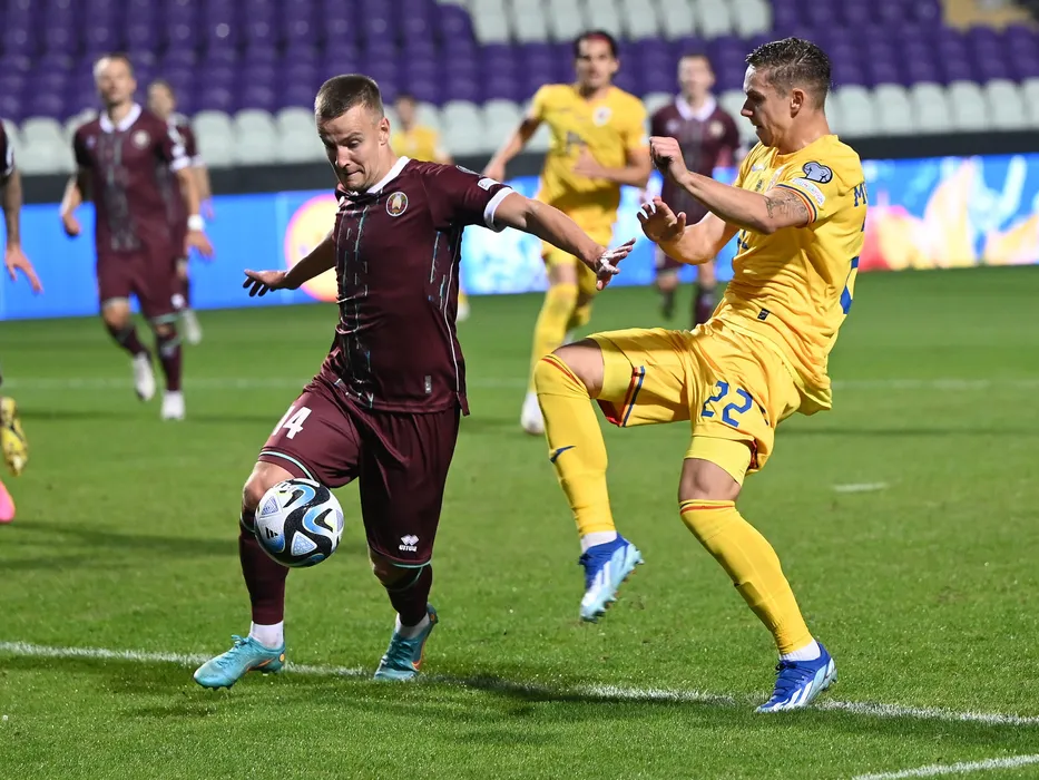 Sergei Karpovich si Louis Munteanu in meciul de fotbal dintre Belarus si Romania, din cadrul preliminariilor Campionatului European 2024, desfasurat pe Stadionul Szusza Ferenc din Budapesta, joi 12 octombrie 2023. © FOTO:Razvan Pasarica/SPORT PICTURES