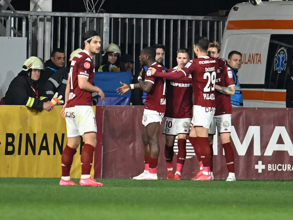Claudiu Adrian Mihai Petrila se bucură dupa un gol anulat marcat alături de Tobias Christensen, Abdul Kader Keita si Mihai Alexandru Dobre in meciul de fotbal dintre Rapid Bucuresti si FCSB, din cadrul Play off-ului Superligii Superbet, desfasurat pe Superbet Arena Giulesti din Bucuresti, luni 27 aprilie 2025. © FOTO:Razvan Pasarica/SPORT PICTURES