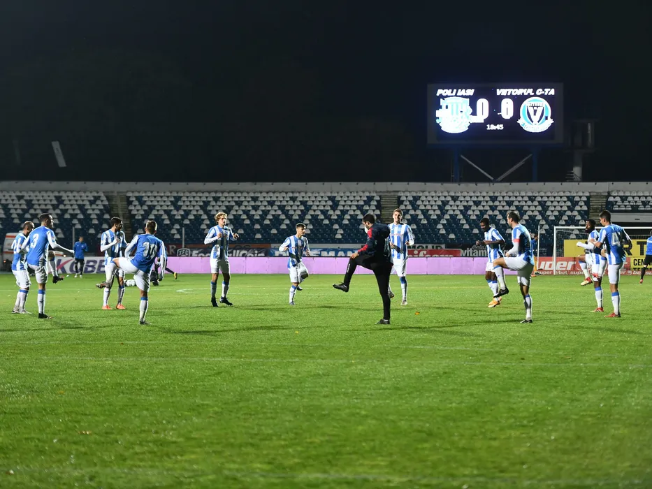 Fotbalistii ieseni se incalzesc inaintea meciului de fotbal dintre CSM Politehnica Iasi si FC Viitorul Constanta, contand pentru Liga 1 Casa Pariurilor, desfasurat fara spectatori pe Stadionul Emil Alexandrescu din Iasi, duminica 1 noiembrie 2020. © FOTO:Razvan Pasarica/SPORT PICTURES