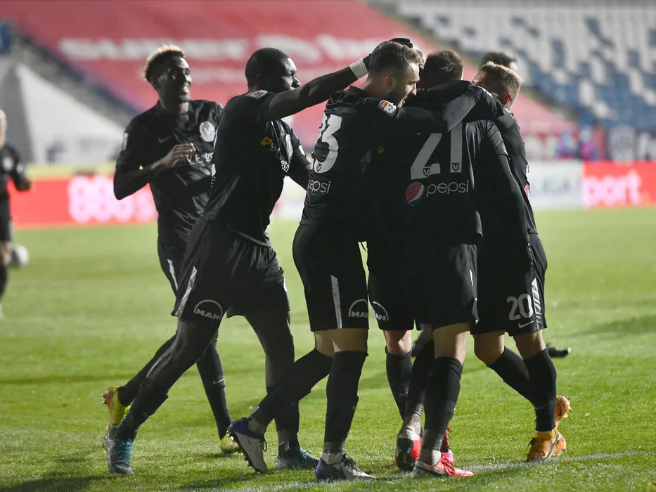 Kevin Luckassen si Virgil Eugen Ghita il felicita pe Alin Dobrosavlevici dupa un gol marcat in meciul de fotbal dintre CSM Politehnica Iasi si FC Viitorul Constanta, contand pentru Liga 1 Casa Pariurilor, desfasurat fara spectatori pe Stadionul Emil Alexandrescu din Iasi, duminica 1 noiembrie 2020. © FOTO:Razvan Pasarica/SPORT PICTURES