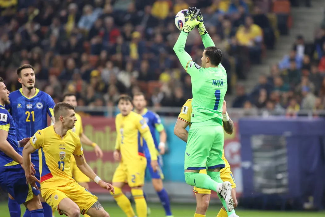 Portarul Florin Nita (D), de la echipa nationala de fotbal a Romaniei, prinde o minge, in timpul meciului contra selectionatei Bosniei din preliminariile Campionatului Mondial 2026, disputat pe Arena Nationala din Bucuresti, vineri, 21 martie 2025. SORIN PANA / MEDIAFAX FOTO