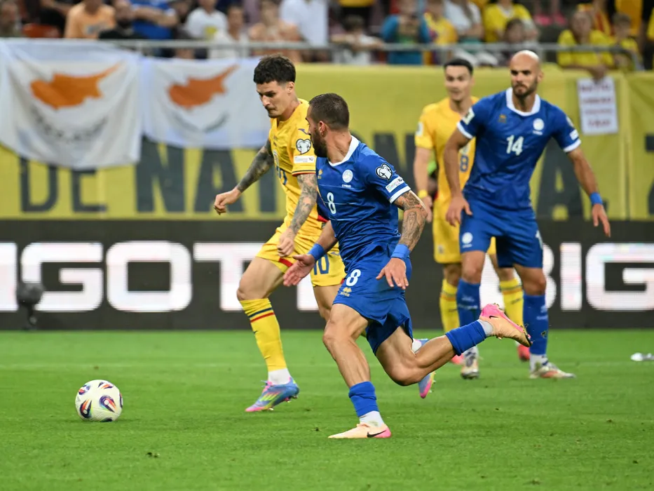 Raul Oprut marcheaza un gol de langa Charalampos Kyriakou in meciul de fotbal dintre Romania si Cipru, din cadrul Preliminariilor Campionatului Mondial 2026, desfasurat pe Arena Nationala din Bucuresti, marti 10 iunie 2025. © FOTO:Razvan Pasarica/SPORT PICTURES