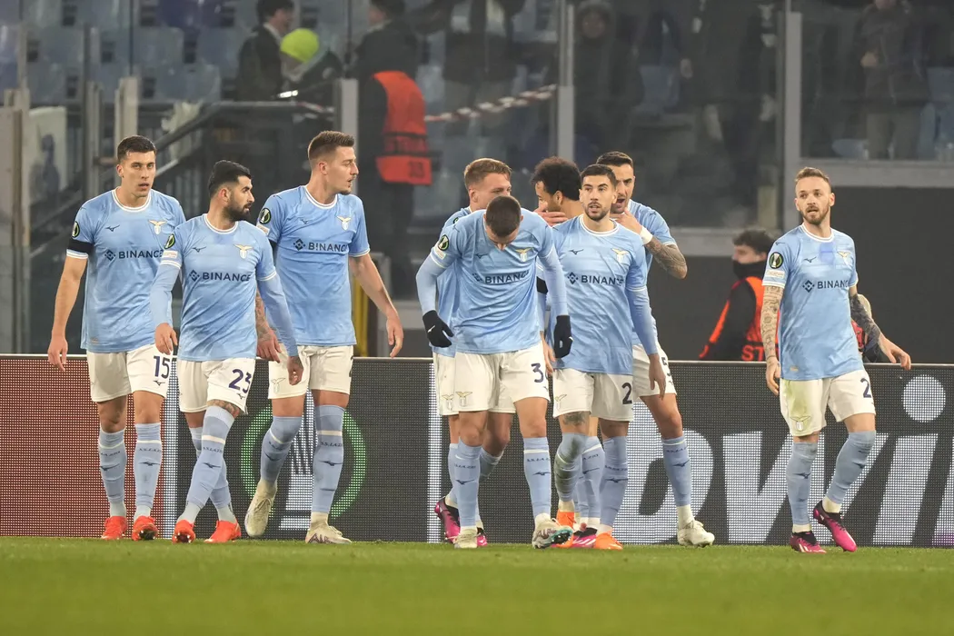 Lazio's Ciro Immobile celebrates with teammates after scoring the opening goal during an Europa Conference League playoff first leg soccer match between Lazio and CFR Cluj, at Rome's Olympic Stadium, Thursday, Feb. 16, 2023. (AP Photo/Andrew Medichini)