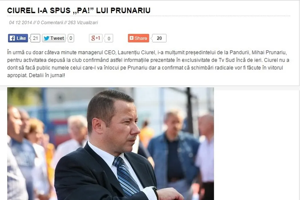 Ciurel l-a dat afară pe președintele Pandurilor. Urmează ca Grigoraș să fie schimbat cu Edi Iordănescu