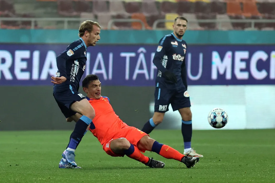 Claudiu Keseru (C), de la FCSB, suteaza in timpul meciului de fotbal contra echipei UTA Arad din etapa a XVIII-a a Ligii 1, disputat pe Arena Nationala din Bucuresti, duminica, 5 decembrie 2021. GEORGE FILIP/ MEDIAFAX FOTO