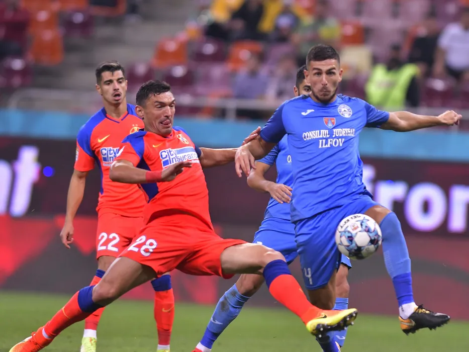 Claudiu Andrei Keseru si Amir Bilali in meciul de fotbal dintre FCSB si Academica Clinceni, contand pentru Liga 1 Casa Pariurilor, desfasurat pe Stadionul Marin Anastasovici din Giurgiu, sambata 25 septembrie 2021. © FOTO:Razvan Pasarica/SPORT PICTURES