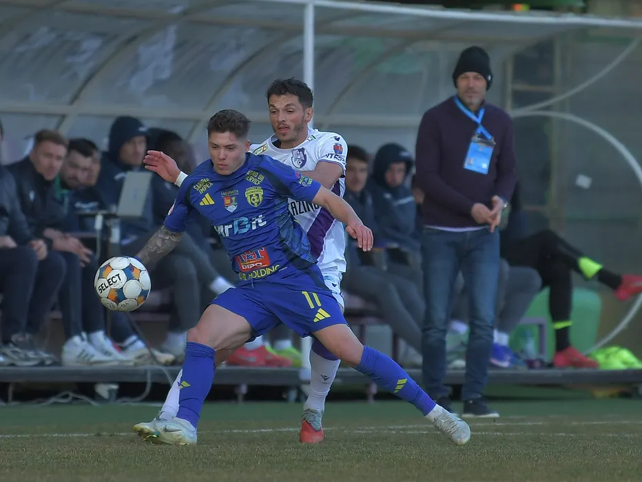 Andrei Fernando Dragu si Gabriel Dorinel Oancea in meciul de fotbal dintre FC Arges si AFC Unirea 04 Slobozia, contand pentru Superliga Superbet, desfasurat pe Stadionul Orasenesc din Mioveni, duminica 8 martie 2026. © FOTO:Mihai Nitoiu/SPORT PICTURES