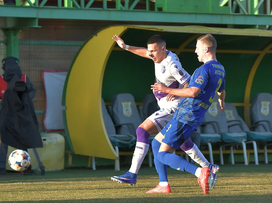 Robert Marian Moldoveanu si Oleksandr Safronov in meciul de fotbal dintre FC Arges si AFC Unirea 04 Slobozia, contand pentru Superliga Superbet, desfasurat pe Stadionul Orasenesc din Mioveni, duminica 8 martie 2026. © FOTO:Mihai Nitoiu/SPORT PICTURES
