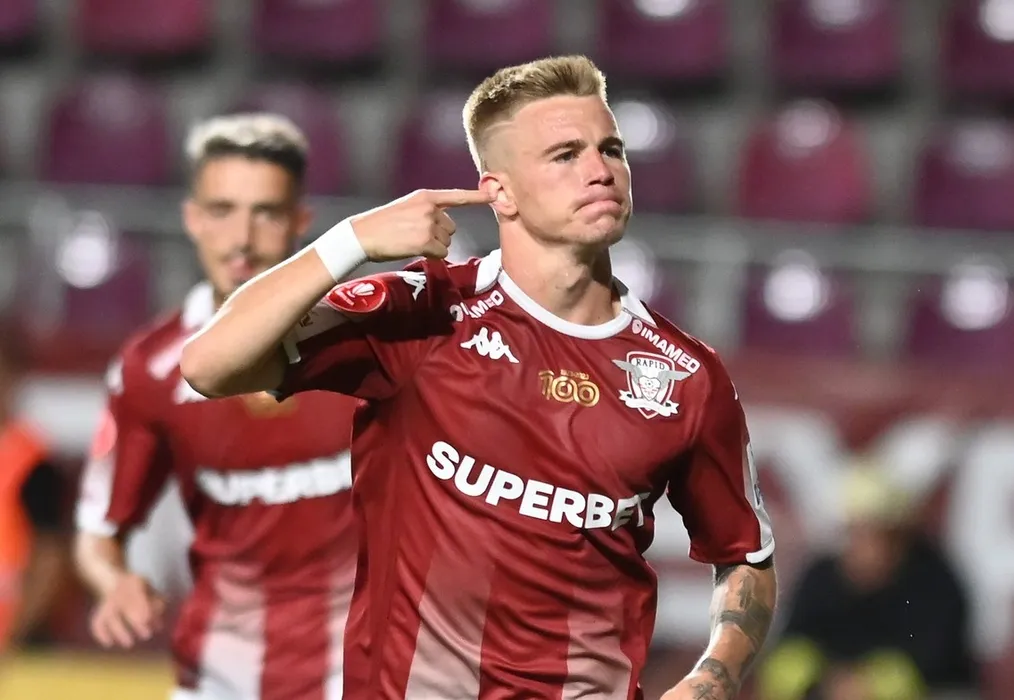 Claudiu Adrian Mihai Petrila se bucura dupa un gol marcat in meciul de fotbal dintre Rapid Bucuresti si Dinamo Bucuresti, din cadrul Superligii Superbet, desfasurat pe Superbet Arena-Giulesti din Bucuresti, vineri 1 septembrie 2023.,Image: 802622351, License: Rights-managed, Restrictions: , Model Release: no