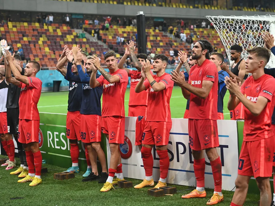 Fotbalistii stelisti David Raul Miculescu, Ianis Ilie Stoica, Florinel Teodor Coman, Andrea Compagno si Octavian George Popescu saluta galeria dupa meciul de fotbal dintre FCSB si RSC Anderlecht Bruxelles, din cadrul grupelor UEFA Europa Conference League, desfasurat pe Arena Nationala din Bucuresti, joi 15 septembrie 2022. © FOTO:Razvan Pasarica/SPORT PICTURES
