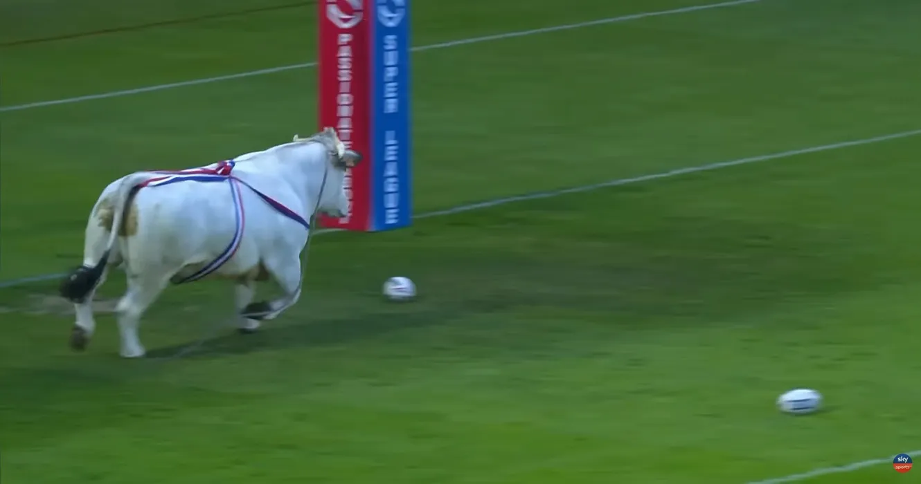 Clipe de teroare la un meci de rugby din Franța: un taur uriaș a scăpat pe teren și a început să îi alerge pe jucătorii îmbrăcați în echipament roșu! Sportivii au sărit în tribună pentru a scăpa de furia animalului dezlănțuit | VIDEO