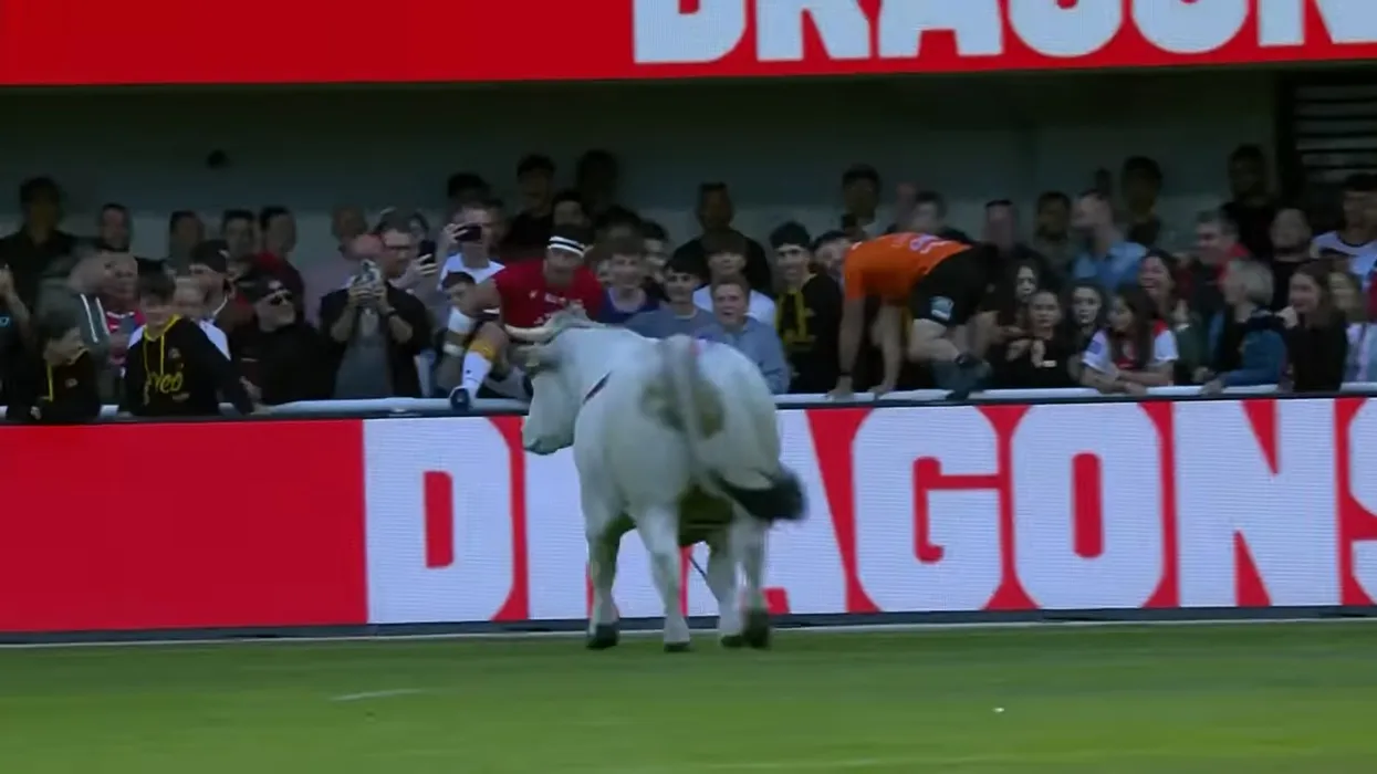 Clipe de teroare la un meci de rugby din Franța: un taur uriaș a scăpat pe teren și a început să îi alerge pe jucătorii îmbrăcați în echipament roșu! Sportivii au sărit în tribună pentru a scăpa de furia animalului dezlănțuit | VIDEO