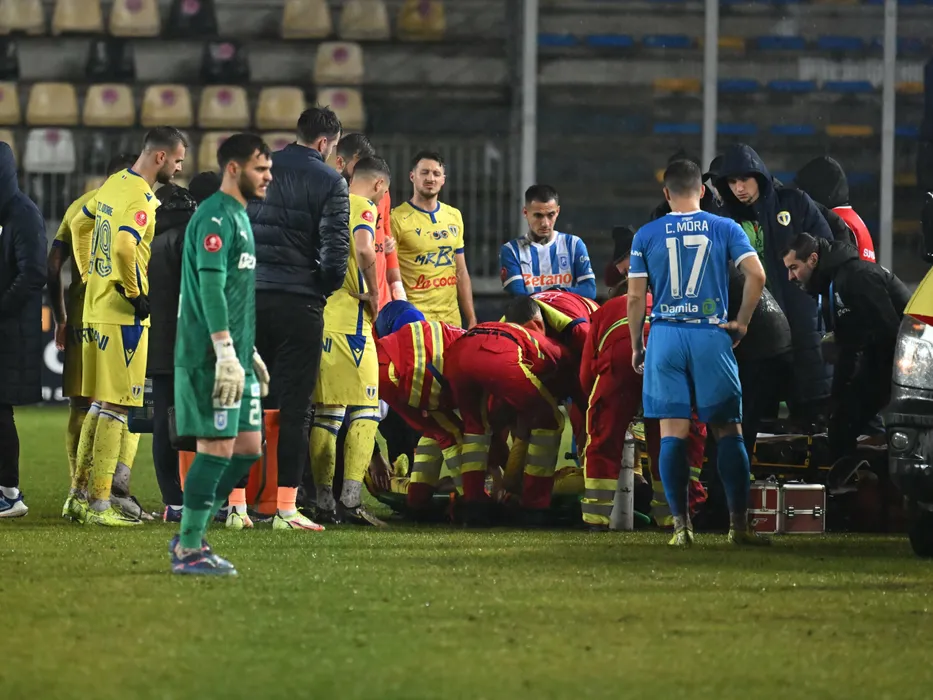 Alexandru Tudorie, Lucian Mihai Dumitriu si Ionuț Alexandru Mitriță reacționează la prabusirea pe teren a lui Yohan Cedric Benjamin Roche in meciul de fotbal dintre Petrolul Ploiesti si Universitatea Craiova, din cadrul Superligii Superbet desfasurat pe Stadionul Ilie Oana din Ploiesti, sambata 7 decembrie 2024. © FOTO:Razvan Pasarica/SPORT PICTURES