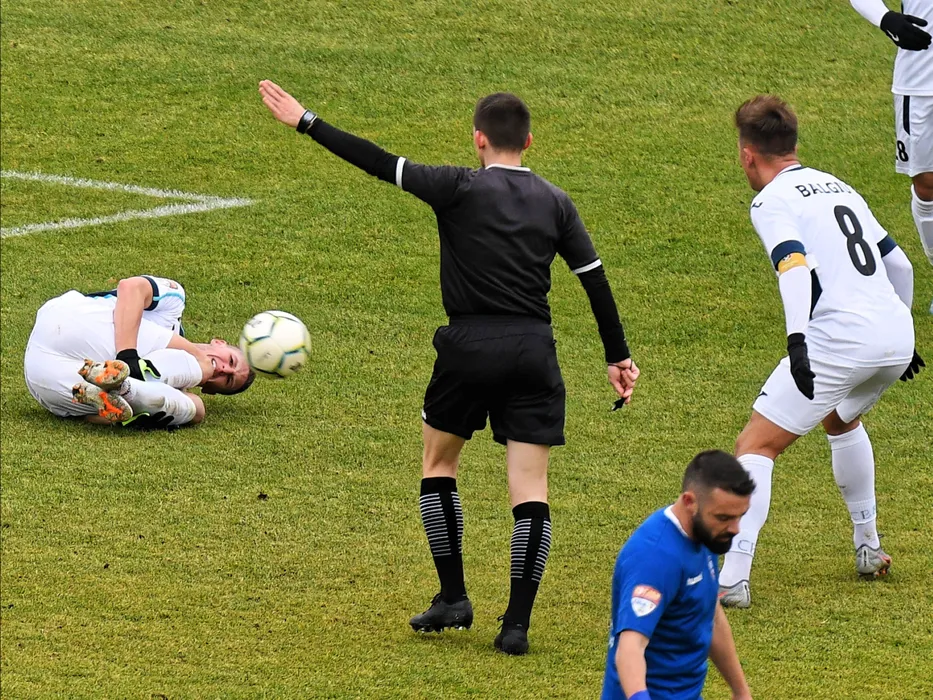 Arbitrul central Andrei Baciu acorda lovitura libera in urma unui fault comis asupra lui Iulian Rosu, la pamant, in meciul de fotbal dintre SCM Gloria Buzau si ACS Fotbal Comuna Recea, contand pentru Liga a-2-a Casa Pariurilor, desfasurat fara spectatori pe Stadionul Gloria din Buzau, miercuri 18 noiembrie 2020. © FOTO:Adi Berger/SPORT PICTURES