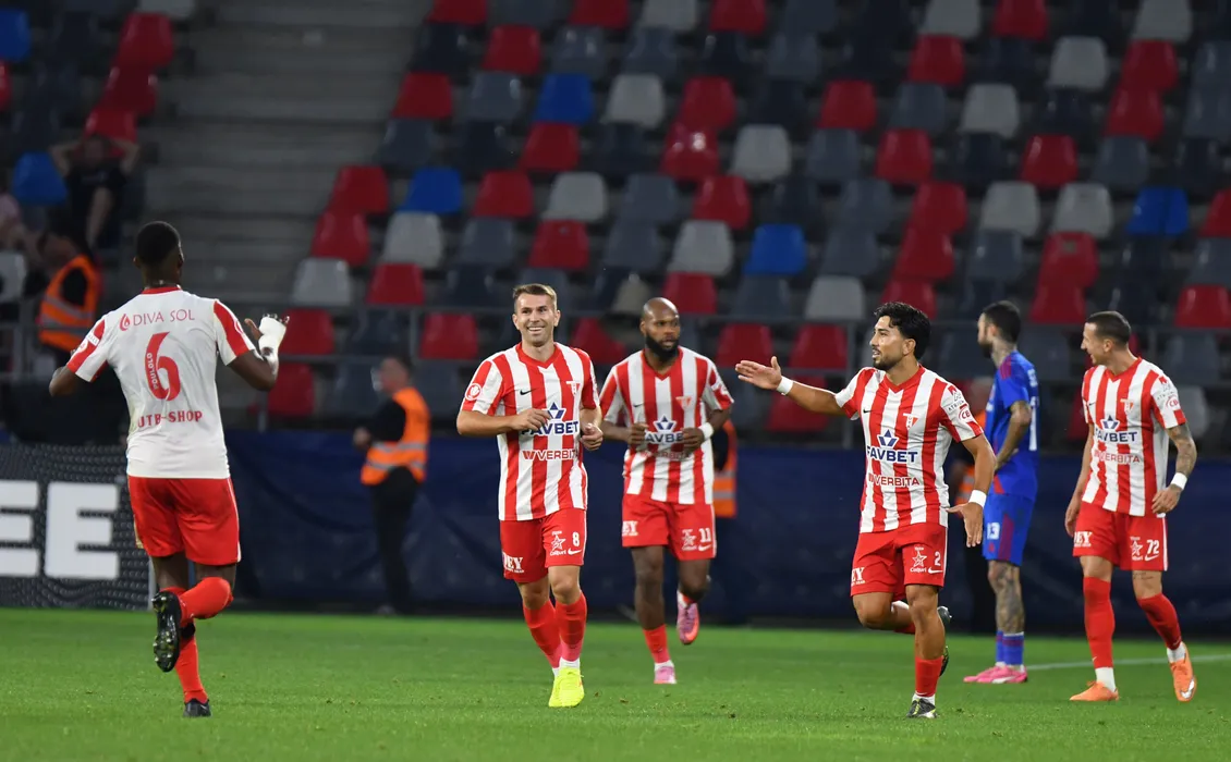 Fotbalistii aradeni se bucura dupa un gol marcat de Alin Roman in meciul de fotbal dintre Steaua Bucuresti si UTA Arad, contand pentru Cupa Romaniei Betano, desfasurat pe Stadionul Steaua din Bucuresti, marti 26 august 2025. © FOTO:George Ilinca/SPORT PICTURES