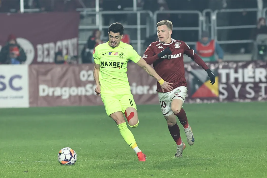 Valentin Gheorghe si Claudiu Adrian Mihai Petrila in meciul de fotbal dintre FC Rapid 1923 Bucuresti si Poli Iasi, din cadrul Superligii Superbet, desfasurat pe Superbet Arena-Giulesti din Bucuresti, luni 20 ianuarie 2025. © FOTO: Gheorghe Fluster/SPORT PICTURES