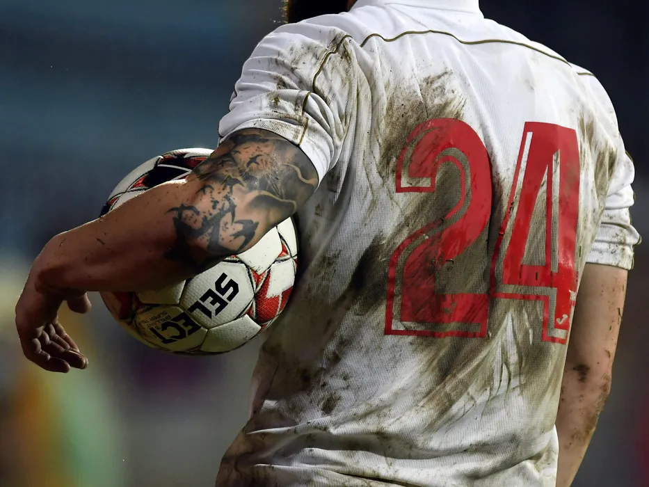 Tricou plin de noroi si o minge in meciul de fotbal dintre AFC Hermannstadt si FC Viitorul, contand pentru Liga 1 Casa Pariurilor, desfasurat pe Stadionul Trans-Sil din Targu Mures,vineri 8 noiembrie 2019. © FOTO:Razvan Pasarica/SPORT PICTURES