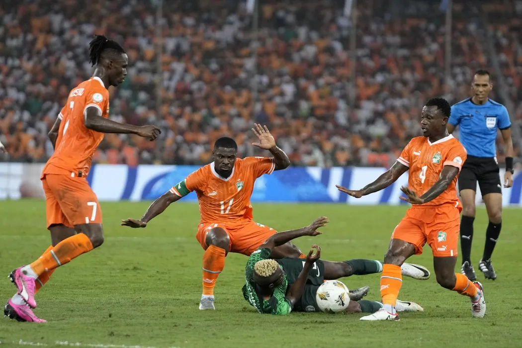 Ivory Coast players crowd around Nigeria's Victor Osimhen during the African Cup of Nations final soccer match between Ivory Coast and Nigeria, at the Olympic Stadium of Ebimpe in Abidjan, Ivory Coast, Sunday, Feb. 11, 2024.,Image: 845689717, License: Rights-managed, Restrictions: This content is intended for editorial use only. For other uses, additional clearances may be required., Model Release: no, Pictured: Victor Osimhen