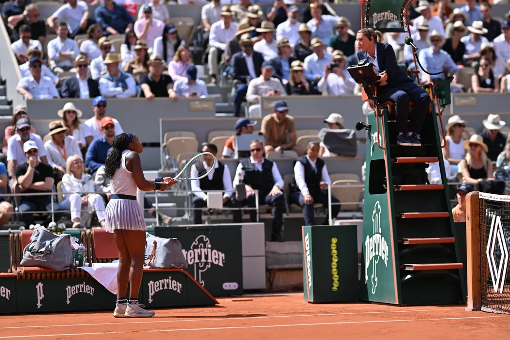 PARIS, FRANCE - JUNE 06: US Coco Gauff argues with referee during competing against Poland's Iga Swiatek (not seen) during their women's singles semi final match on Court Philippe-Chatrier on day twelve of the French Open tennis tournament at the Roland Garros Complex in Paris on June 6, 2024. Mustafa Yalcin / Anadolu/ABACAPRESS.COM,Image: 879396049, License: Rights-managed, Restrictions: , Model Release: no