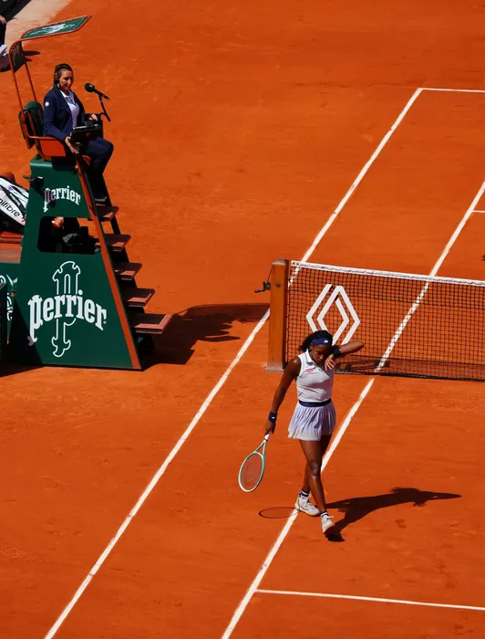 Coco Gauff disputes a call from the umpire Aurelie Tourte and appears to be in tears shortly after
