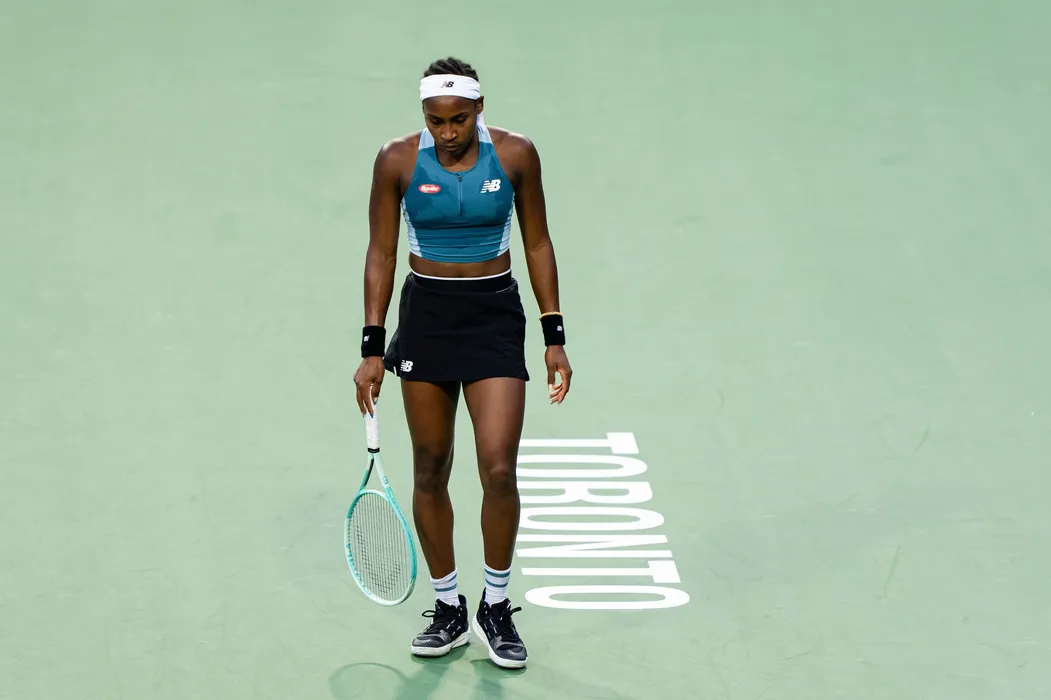 Coco Gauff of USA reacts after losing a point during the main draw round of 16 match against Diana Shnaider of Russia on day 4 at Sobeys Stadium in Toronto, Canada. Shnaider won the match, 6-4, 6-1.