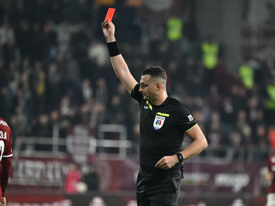 Arbitrul central Andrei Moroita acordă un cartonaș roșu in meciul de fotbal dintre Rapid Bucuresti si Farul Constanta, din cadrul Superligii Superbet, desfasurat pe Superbet Arena-Giulesti din Bucuresti, luni 21 octombrie 2024. © FOTO:Razvan Pasarica/SPORT PICTURES