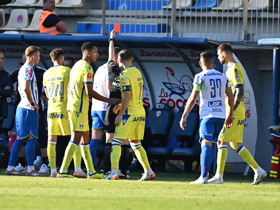 Arbitrul central Sorin Vadana acorda un cartonas rosu lui Florian Kamberi sub privirile lui Yohan Cedric Benjamin Roche si Alexandru Tudorie in meciul de fotbal dintre Petrolul Ploiesti si Politehnica Iasi, din cadrul Superligii Superbet, desfasurat pe Stadionul Ilie Oana din Ploiesti, sambata 26 octombrie 2024. © FOTO:Razvan Pasarica/SPORT PICTURES
