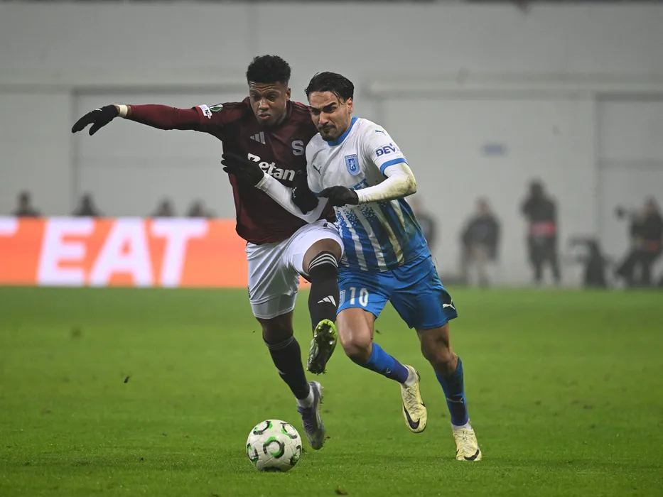 John Mercado si Stefan Baiaram in meciul dintre Universitatea Craiova si Sparta Praga, contand pentru UEFA Conference League, desfasurat pe Stadionul Ion Oblemenco din Craiova, joi 11 decembrie 2025. © FOTO:Razvan Pasarica/SPORT PICTURES