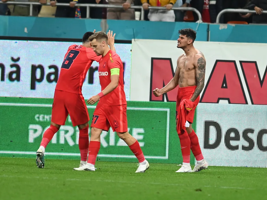 Florinel Teodor Coman se bucura dupa un gol marcat alaturi de Darius Dumitru Olaru in meciul de fotbal dintre FCSB si CFR Cluj, contand pentru Play-off-ul Superligii Superbet, desfasurat pe Arena Nationala din Bucuresti, duminica 14 mai 2023. © FOTO:Razvan Pasarica/SPORT PICTURES
