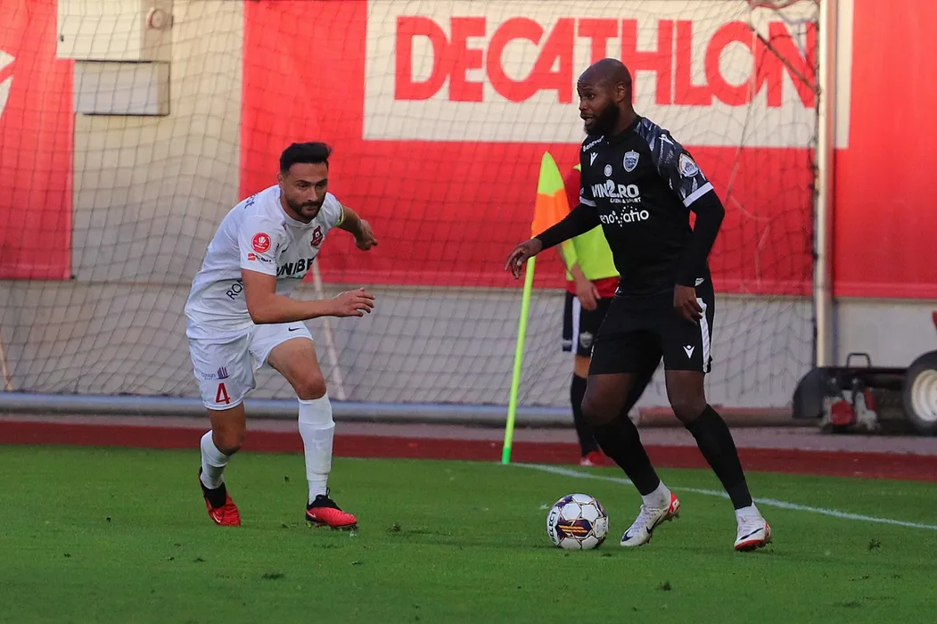 Ionut Stoica și Hakim Djamel Abdallah în meciul de fotbal dintre AFC HERMANNSTADT SIBIU si FC DINAMO BUCURESTI, contând pentru Superliga Superbet, desfășurat pe Stadionul Municipal din Sibiu, sâmbătă 21 octombrie 2023. © FOTO: Valentin MACREA/SPORT PICTURES