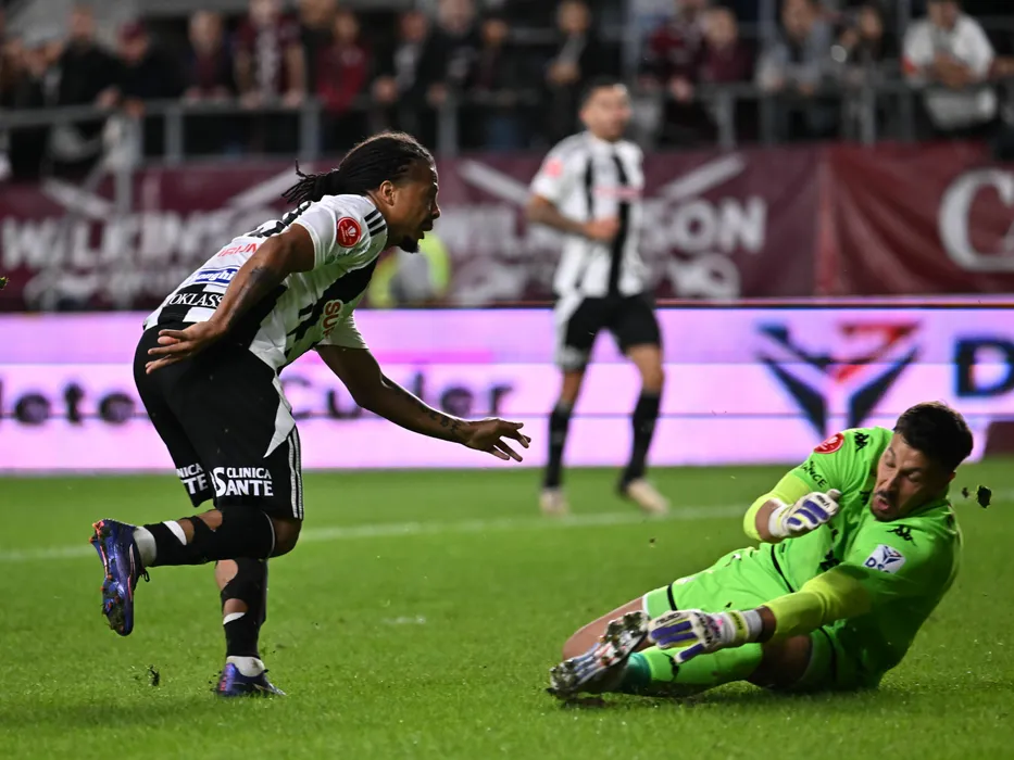 Hildeberto Jose Morgado Pereira marchează un gol în poarta lui Benjamin Kevin Siegrist in meciul de fotbal dintre Rapid Bucuresti si Universitatea Cluj, din cadrul Superligii Superbet, desfasurat pe Superbet Arena-Giulesti din Bucuresti, luni 16 septembrie 2024. © FOTO:Razvan Pasarica/SPORT PICTURES