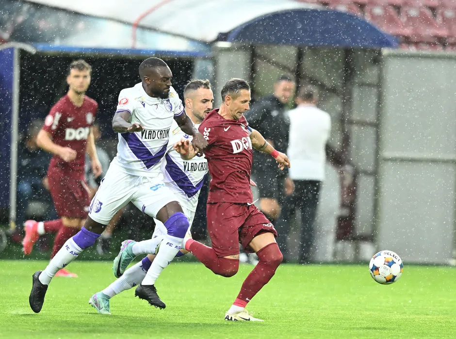 Ciprian Ioan Deac si Fernandez Esteban Orozco, Laurentiu Ionut Radescu in meciul de fotbal dintre FC CFR 1907 Cluj si FC Arges, contand pentru Superliga Superbet, desfasurat pe Stadionul Dr.Constantin Radulescu din Cluj-Napoca, duminica 27 iulie 2025. © FOTO:Flaviu Buboi/SPORT PICTURES
