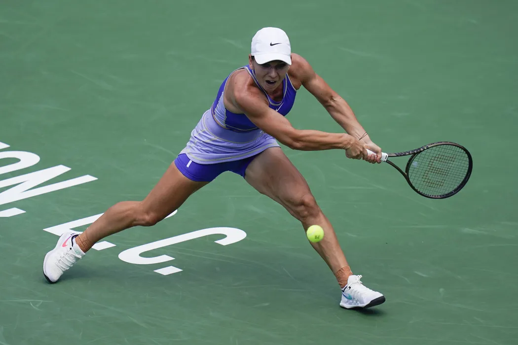 Romania's Simona Halep returns during a first round match against Spain's Cristina Bucsa at the Citi Open tennis tournament in Washington, Monday, Aug. 1, 2022. (AP Photo/Carolyn Kaster)