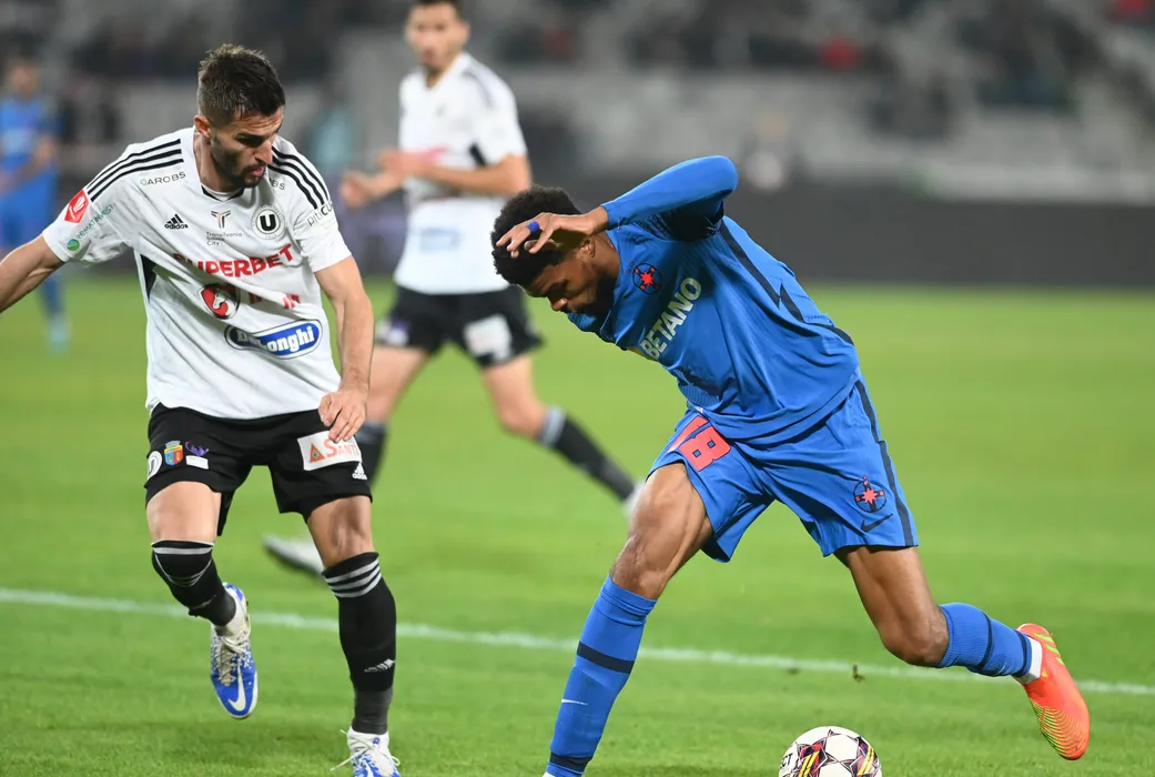 Ovidiu Andrei Pitian si Sylas Laouari Edjouma Malcom in meciul de fotbal dintre Universitatea Cluj si FCSB, contand pentru Superliga Superbet, desfasurat pe Cluj Arena din Cluj Napoca, duminica 31 octombrie 2022. © FOTO:Razvan Pasarica/SPORT PICTURES