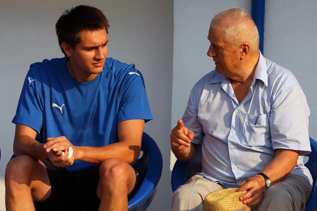 Jean Padureanu (D), presedintele echipei Gloria Bistrita, discuta cu portarul Ciprian Tatarusanu (S) inainte de meciul cu Steaua Bucuresti, din cadrul etapei a V-a a Ligii I, la Bistrita, sambata, 23 august 2008. MIRCEA ROSCA / MEDIAFAX FOTO