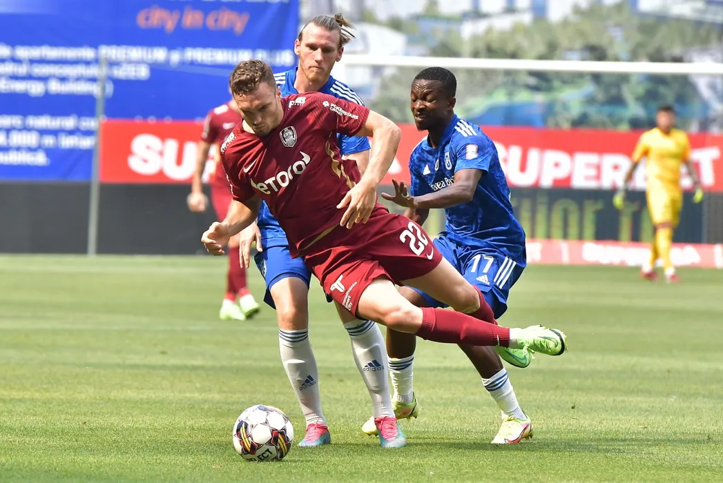 Gabriel Debeljuh (S), de la CFR Cluj, lupta pentru balon cu Samuel Asamoah (D), de la U Craiova 1948, in meciul de fotbal din etapa a II-a a Superligii, disputat pe Complexul Sportiv Craiova, duminica, 24 iulie 2022. REMUS BADEA / MEDIAFAX FOTO