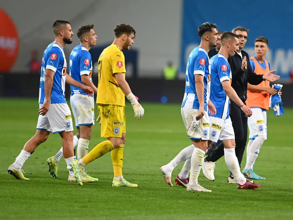 Fotbalistii craioveni Gjoko Zajkov, Alexandru George Cimpanu, Iulian Laurentiu Popescu, Andrei Virgil Ivan si Alexandru Mateiu parasesc tristi terenul alaturi de antrenorul lor Eugen Neagoe meciul de fotbal dintre Universitatea Craiova si Sepsi OSK Sfantu Gheorghe, contand pentru Play-off-ul Superligii Superbet, desfasurat pe Stadionul Ion Oblemenco din Craiova, duminica 28 mai 2023. © FOTO:Razvan Pasarica/SPORT PICTURES