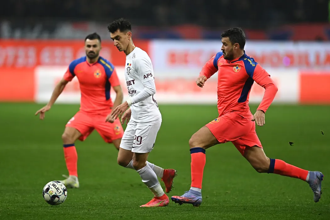 Constantin Budescu (D), de la FCSB, lupta pentru balon cu Albert Stahl (S), de la Rapid, in meciul de fotbal din etapa a XX-a a Ligii 1, disputat pe Arena Nationala din Bucuresti, miercuri, 15 decembrie 2021. EDUARD VINATORU / MEDIAFAX FOTO