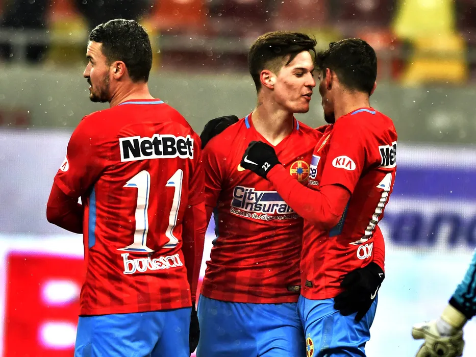 Fotbalistii Stelei Constntin Budescu,Florinel Coman si Dennis Man se bucura dupa un gol marcat in meciul de fotbal dintre FC Steaua Bucuresti si Sepsi OSK Sfantu Gheorghe, contand pentru Liga 1 Betano, desfasurat pe Arena Nationala din Bucuresti, duminica 25 februarie 2018. © FOTO Razvan Pasarica/SPORT PICTURES