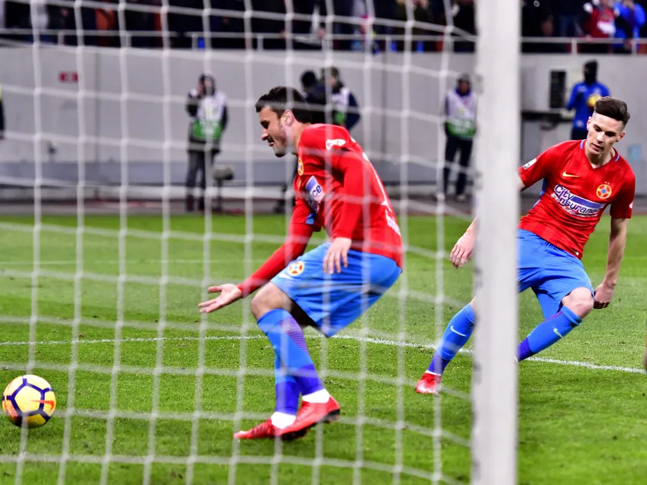 Constantin Budescu si Dennis Man in meciul de fotbal dintre FC Steaua Bucuresti si CFR Cluj, din cadrul Ligii 1 Betano, desfasurat pe Arena Nationala din Bucuresti, sambata 10 februarie 2018. © FOTO Razvan Pasarica/SPORT PICTURES