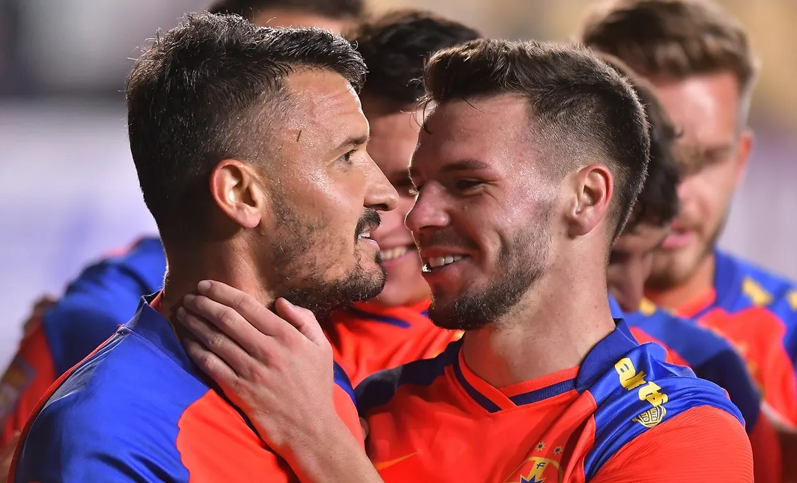 Constantin Valentin Budescu se bucura dupa un gol marcat alaturi de Andrei Ioan Cordea in meciul de fotbal dintre Chindia Targoviste si FCSB, contand pentru Liga 1 Casa Pariurilor, desfasurat pe Stadionul Ilie Oana din Ploiesti, vineri 1 octombrie 2021. © FOTO:Razvan Pasarica/SPORT PICTURES