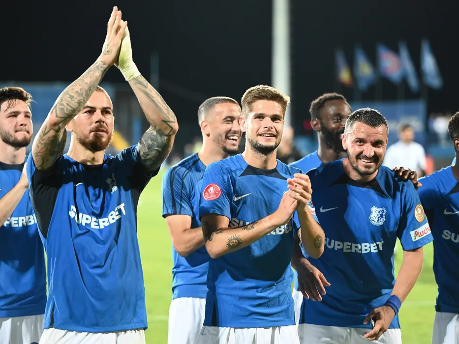 Autorii golurilor Denis Alibec, Diogo Lucas Queiros si Constantin Valentin Budescu se bucura dupa meciul de fotbal dintre Farul Constanta si Flora Tallinn, contand pentru UEFA Europa Conference League, desfasurat pe Stadionul central al Academiei Gheorghe Hagi din Ovidiu, joi 10 august 2023. © FOTO:Razvan Pasarica/SPORT PICTURES