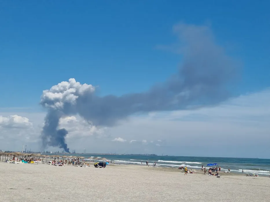 Fumul declansat de incendiul ce a urmat unei explozii ce a avut loc la Rafinaria Petromidia poate fi observat de pe plaja statiunii Mamaia din Constanta, vineri, 2 iulie 2021. MEDIAFAX FOTO